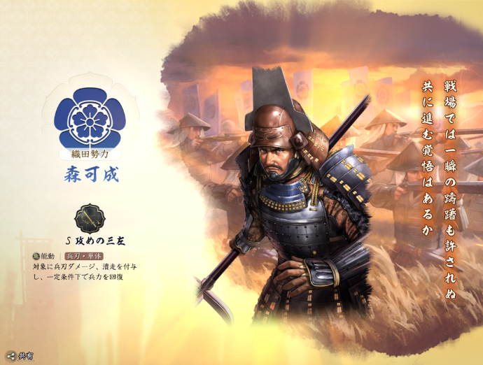 - 武将の部隊編制: 100人以上の武将から自由度の高い部隊を編制できます。武将は「武芸」「茶道」「弁論」「算術」といった四つの能力を象徴する特性を持っており、これらが戦略パートやRPGパートに深く関わります。